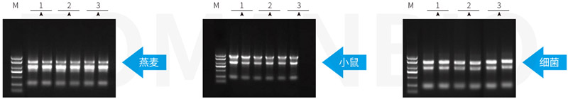 操作可視化:溶液呈粉紅色,便于分離水相和有機相。  以上參考圖分別取50mg燕麥葉片,20mg小鼠肝臟和1ml細(xì)菌DH5α菌液各數(shù)份,組織進(jìn)行液氮研磨處理,菌液離心收集細(xì)胞后,分別加入1ml Zomanbio RNApure 和 T、I公司相應(yīng)產(chǎn)品,按各自說明書進(jìn)行RNA提取。洗脫體積分別為80μl、100μl、60μl。RNA電泳上樣量分別為5μl,1%瓊脂糖凝膠電泳。