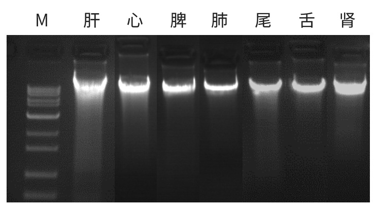 ![]() | 使用ZP332提取10-15mg小鼠不同組織的DNA,洗脫體積:50uL。 1%瓊脂糖凝膠電泳,5v/cm 電泳15 min,上樣量:3ul。 注:M: DL15000 Plus DNA Maker |