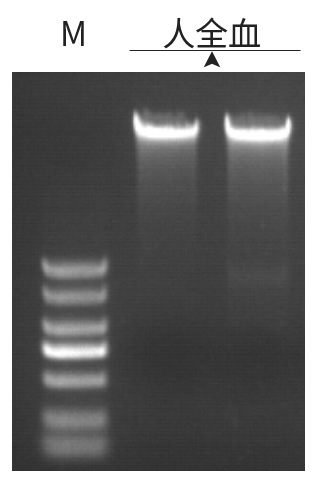 ![]() | 使用ZP332提取200μL新鮮人全血DNA,洗脫體積:50uL。 1%瓊脂糖凝膠電泳,5v/cm 電泳15 min,上樣量:2uL。 注:M: DL2000 DNA Maker |