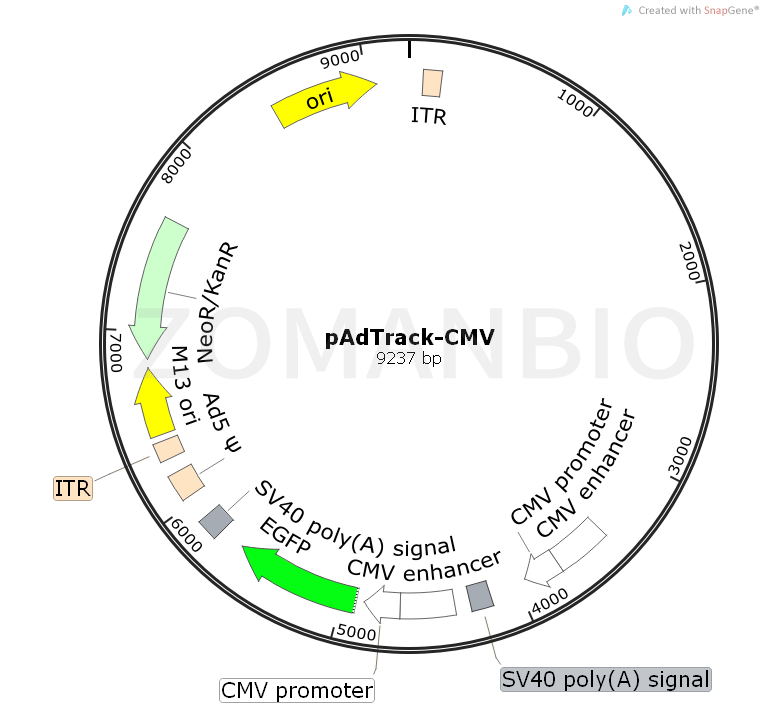 PAdTrack-CMV transgenic adenovirus vector to cell expression vector with CMV promoter and EGFP gene expression of green fluorescent protein tracking results, and use common pAdeasy1 vector maximum can be inserted into the 5.9kb, the use of common pAdeasy2 carrier can insert the 8.6kb. The specific use of the method can refer to the pAdeasy carrier system.