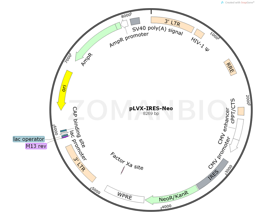 pLVX-IRES-Neo contains all of the viral processing elements necessary for the production of replication-incompetent lentivirus, as well as elements to improve viral titer, transgene expression, and overall vector function. The woodchuck hepatitis virus posttranscriptional regulatory element (WPRE) promotes RNA processing events and enhances nuclear export of viral RNA , leading to increased viral titers from packaging cells. In addition, the vector includes a Rev-response element (RRE), which further increases viral titers by enhancing the transport of unspliced viral RNA out of the nucleus . Finally, pLVX-IRES-Neo also contains a central polypurine tract/central termination sequence element (cPPT/CTS). During target cell infection, this element creates a central DNA flap that increases nuclear import of the viral genome, resulting in improved vector integration and more efficient transduction . The vector also contains a pUC origin of replication and an E. coli ampicillin resistance gene (Ampr) for propagation and selection in bacteria