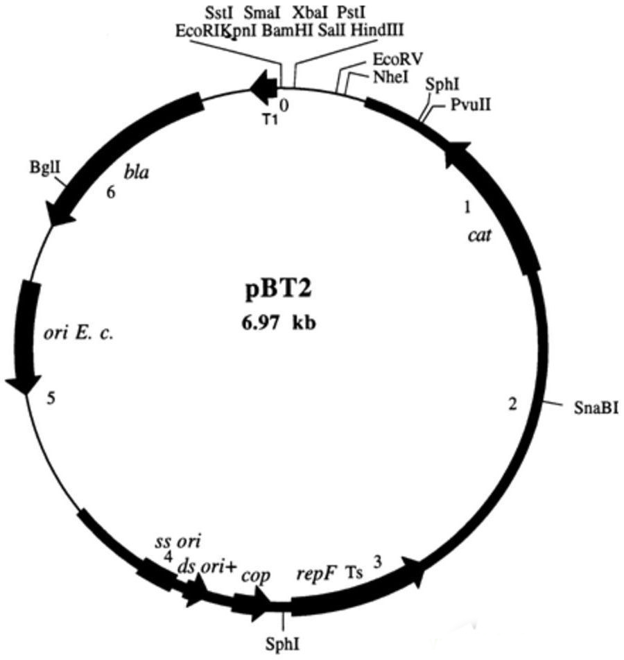 該載體是大腸桿菌-金黃色葡萄球菌穿梭載體,低拷貝,在大腸中抗性為氨芐,在金葡菌中抗性為氯霉素。該質(zhì)粒具有溫度敏感性。