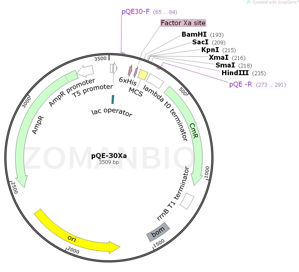 pQE-30Xa質(zhì)粒含有一個強大的噬菌體T5啟動子(被E.coli RNA 聚合酶識別),并含有兩個lac操縱子遏制模塊,用于在E.coli中嚴(yán)謹(jǐn)調(diào)控,高水平表達融合蛋白。在高水平lac遏制子存在的情況下,蛋白合成被有效阻斷,細(xì)胞毒素載體的穩(wěn)定性增強,pQE載體可以在重組蛋白的N端或C端帶上6×His標(biāo)簽。
