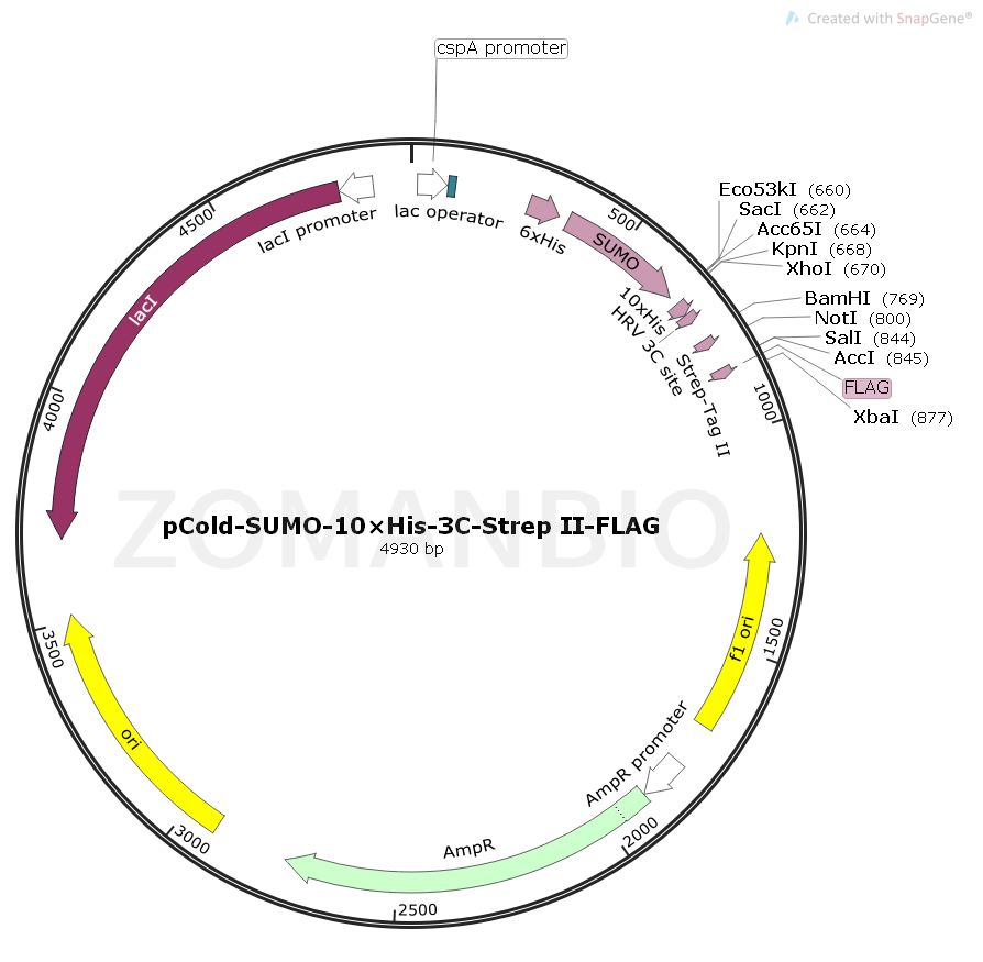 pCold-SUMO-10×His-3C-Strep II-FLAG質(zhì)粒是一個(gè)可以在低溫環(huán)境下表達(dá)的大腸桿菌載體。